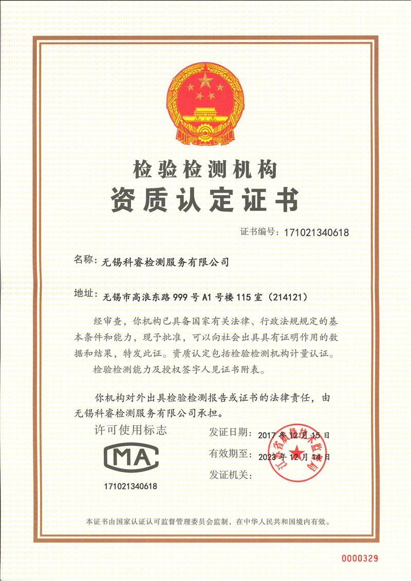 2010年取得CNAS證書,是無錫較早取得證書的民營第三方檢測公司,2014年獲得江蘇省民營科技企業(yè)的稱號,2017年獲得檢驗檢測機構資質認定證書(CMA)等多項榮譽資質。 科睿檢測始終追求先進科學的技術,過硬質量,貼心售后服務贏得了良好的市場口碑,客戶總數(shù)已達到1000 家以上,中國500強企業(yè)已超過100家。